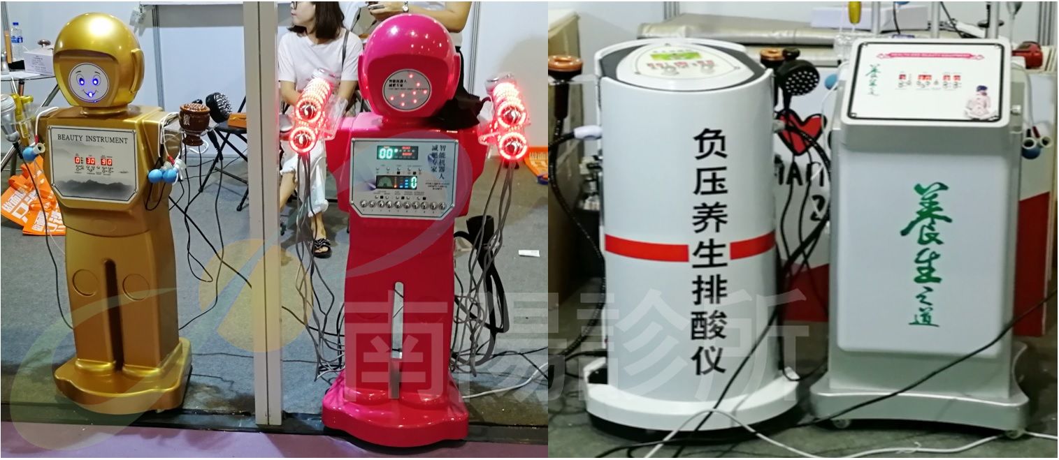 ▲展示會場上各種波、各式機任君挑選,但是否具有真正的治療功效,仍有待商榷。