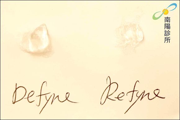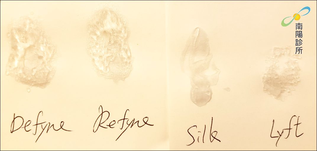 ↑圖中左側為新劑型玻尿酸──Defyne,質地特性具有良好的凝聚力,經搓揉塗抹後仍彼此連結聚合,