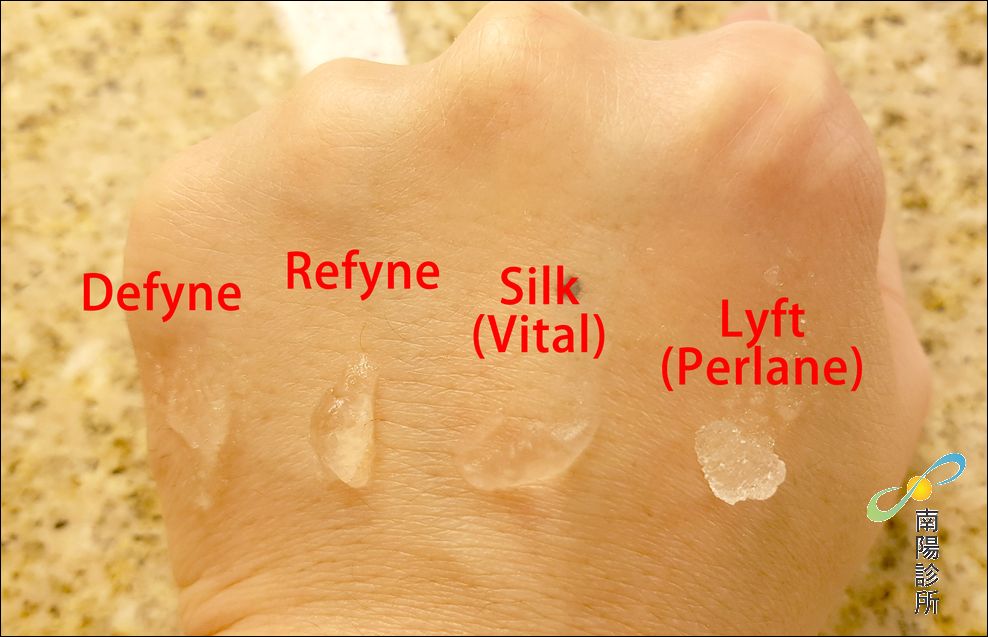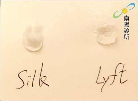 圖左Silk(Vital)乃細小分子玻尿酸、圖右Lyft(Perlane)為中分子玻尿酸。