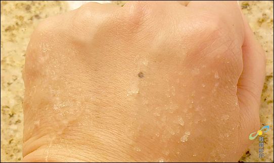 ↑接著,鄧醫師將新舊劑型、不同分子的玻尿酸分別塗抹於手背,親自測試玻尿酸新劑型,