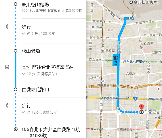 从松山机场外的公车站「松山机场站」搭乘275路线公交车(开往台北客运四海站方向),于「仁爱敦化路口」下车,再步行约十分钟可抵达南阳诊所,路程共约30分钟。